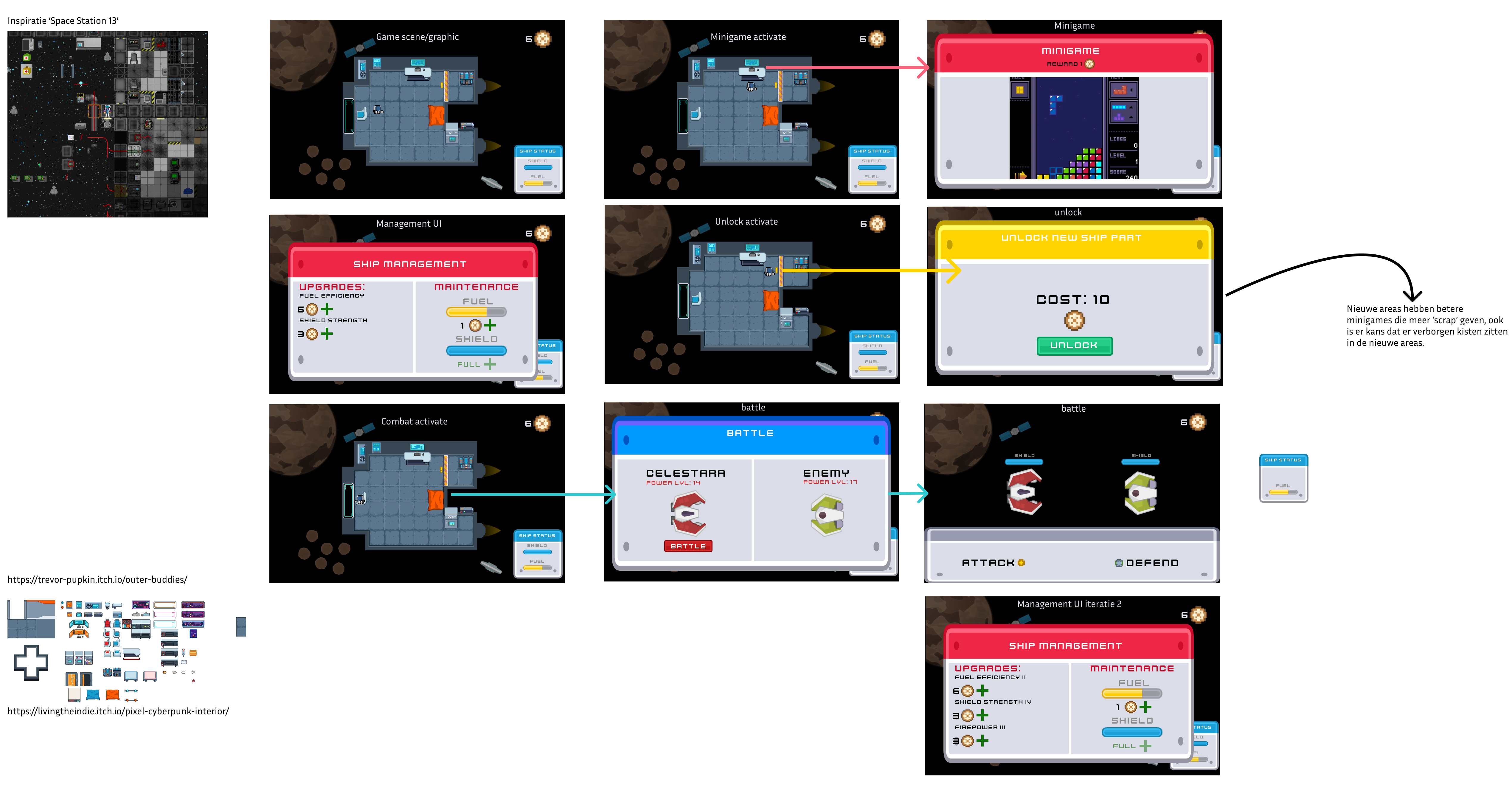 Uit het PoC-geïmplementeerde functionaliteiten Het PoC-document schetste een gedetailleerd plan voor Celestara, inclusief gameplay-mechanismen, een verhaallijn, en minigames. De volgende onderdelen zijn inmiddels gerealiseerd:- Ruimteschipbeheer: Spelers kunnen brandstof en scrap verzamelen, deze middelen gebruiken om hun ruimteschip te upgraden en schade te repareren.