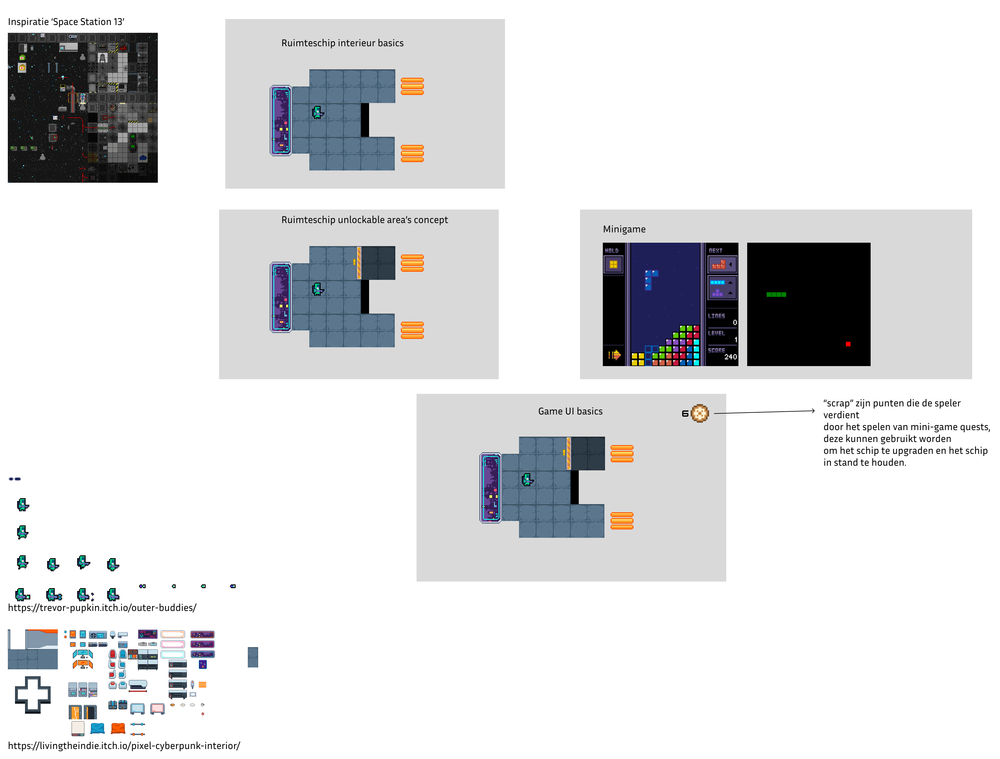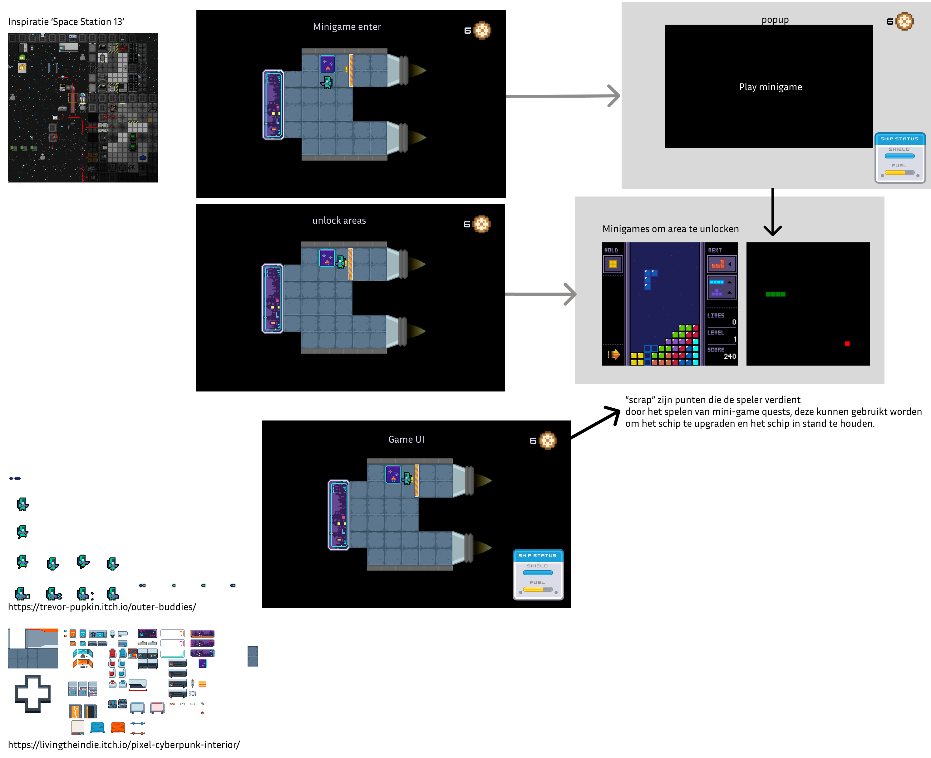 Voordat ik begon met coderen, heb ik tijd besteed aan het ontwerpen van verschillende elementen van de game in Figma. Het doel hiervan was om een duidelijk beeld te creëren van hoe de gebruikersinterface (UI) en verschillende gameplay-elementen eruit zouden zien. Dit omvatte ontwerpen van de HUD, het navigatiesysteem binnen het ruimteschip, en visuele mockups van de minigames.Iteraties